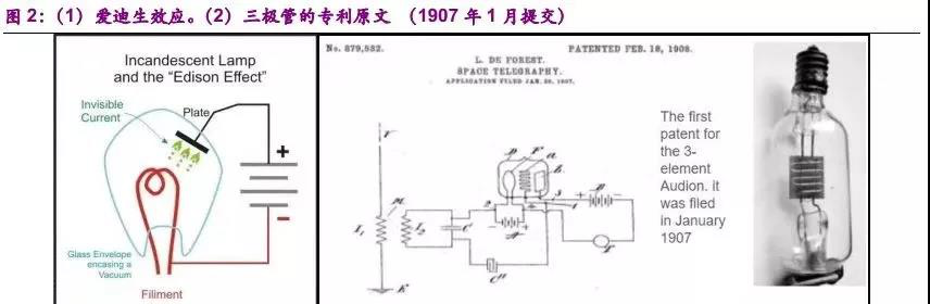 1904年,弗萊明利用愛迪生效應(yīng)研制出第一個二極管(Diode),并獲得了專利,這個二極管可以用來做無線電電報的檢波器。1906年,德·福雷斯特在二極管的燈絲之間巧妙加了一個柵板,發(fā)明了第一個真空電子三極管,用于檢波放大。1912年,美國通用電氣公司和美國電話電報公司合作研制出了高真空電子三極管,使得三極管的放大倍數(shù)大幅提高,工作性能更加穩(wěn)定,從而電子管進(jìn)入了實(shí)用階段,進(jìn)而衍生出了廣播、電視、計算機(jī)等行業(yè),是今天電子產(chǎn)品的奠基石。