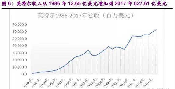 到1972年,英特爾已經(jīng)有超過1000名雇員,銷售額達(dá)到2300萬美元。1974年,英特爾有近3100名員工,銷售額為1.4億美元。到1984年,英特爾銷售額達(dá)到16億美元,在《財富》500強(qiáng)中上升至226名。在此后1986年至2017年期間,英特爾的營業(yè)收入從1986年的12.65億美元增加到2017年的627.61億美元,年均復(fù)合增長率(GAGR)為13.4%,復(fù)合增速相當(dāng)高。